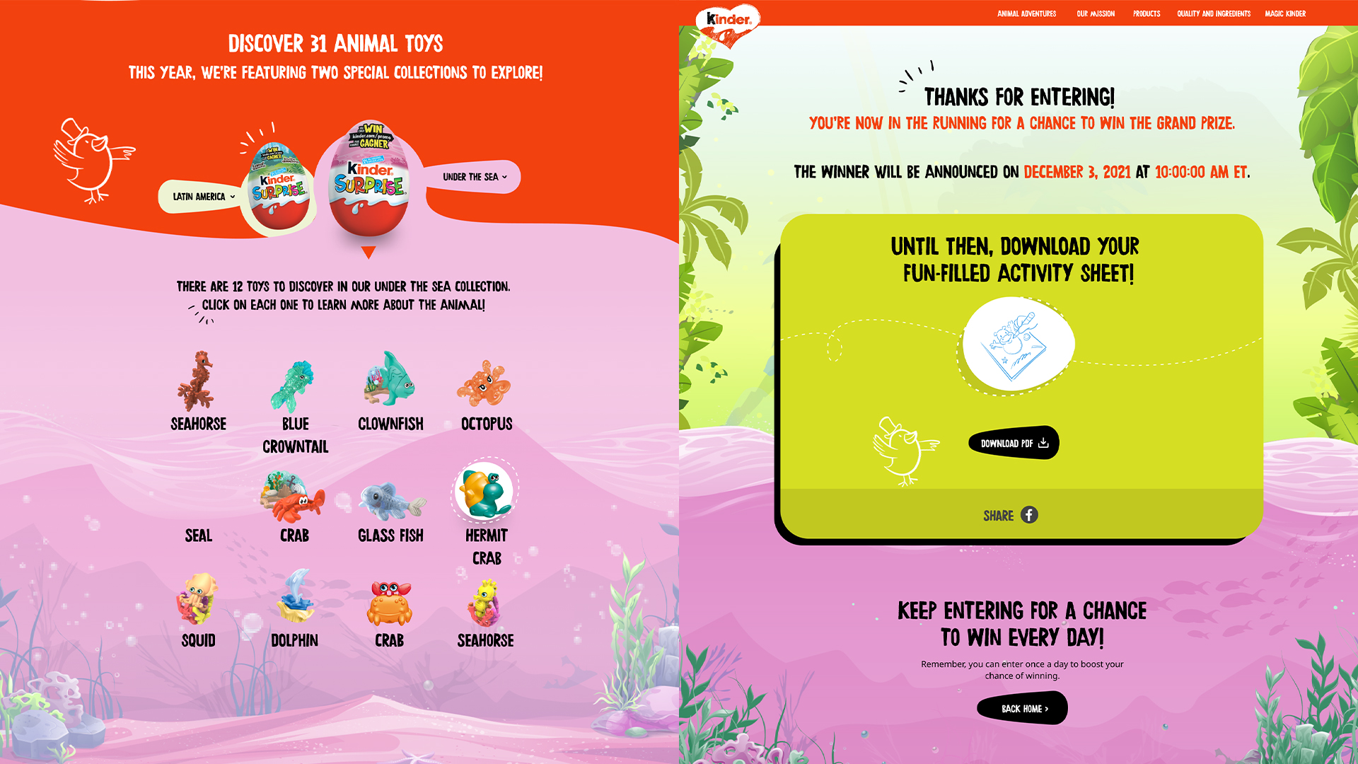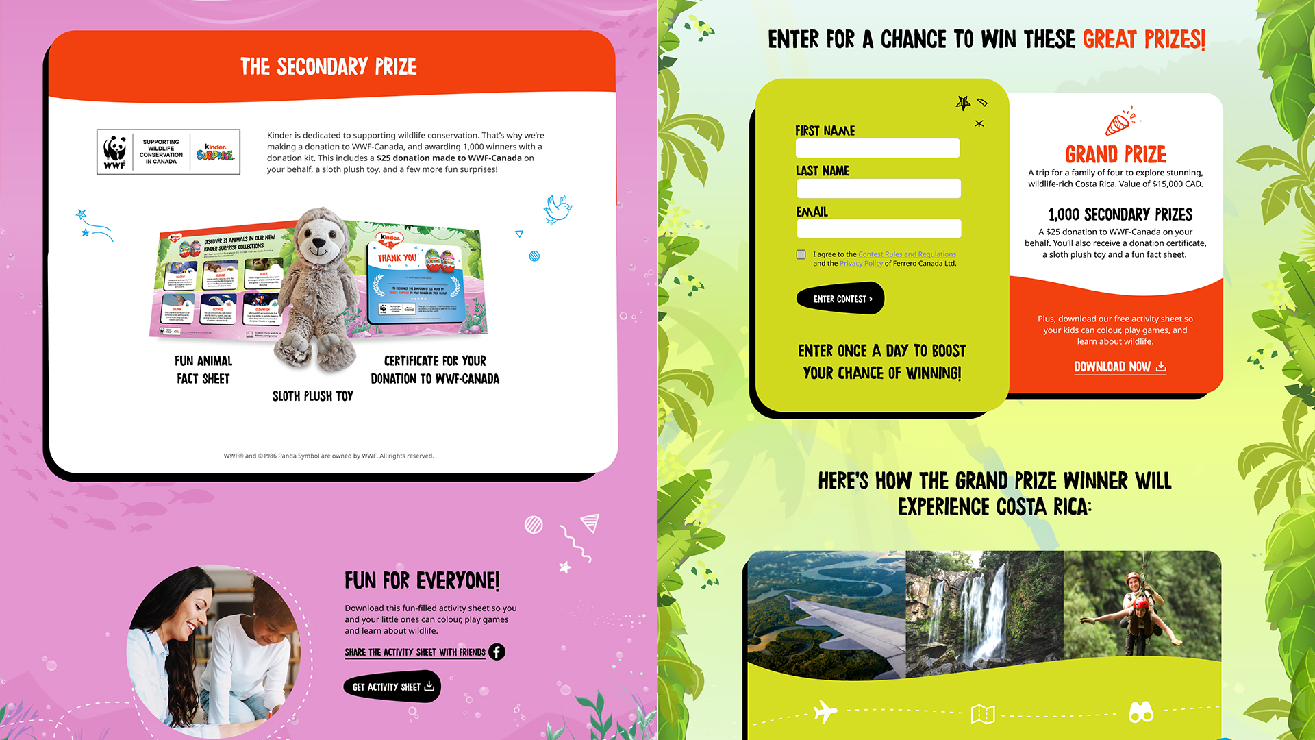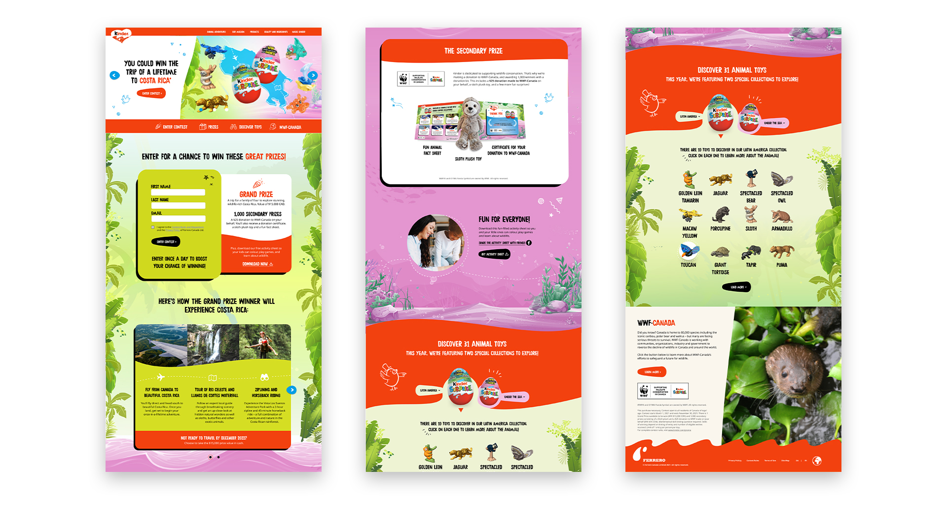 Every year Kinder runs a contest giving families the chance to win a trip, and this year the destination was Costa Rica. The landing page needed to do a few things at once — get kids excited enough to enter, clearly lay out the prizes across three winner tiers, and showcase a lineup of 31 new toys split across two themed collections: under the sea creatures and Latin American land animals.