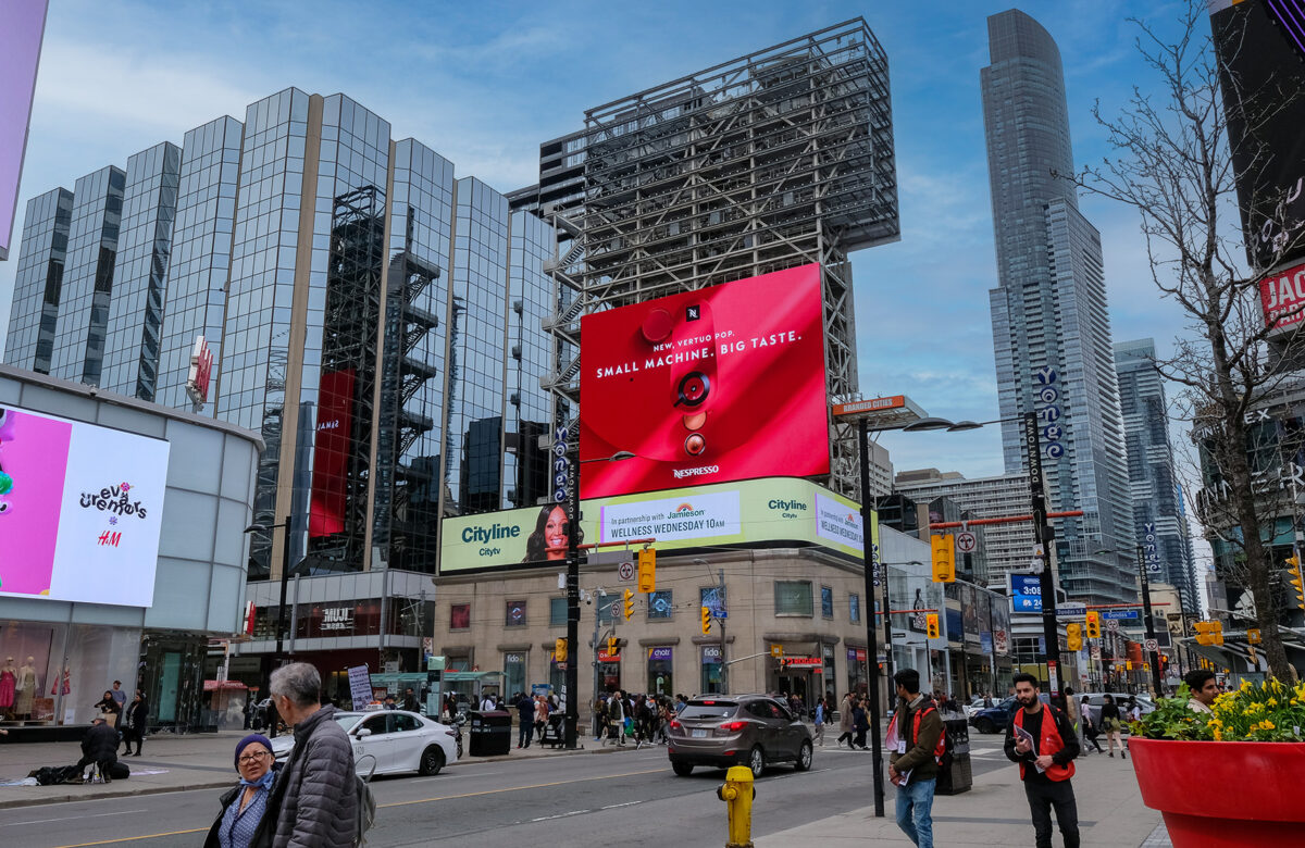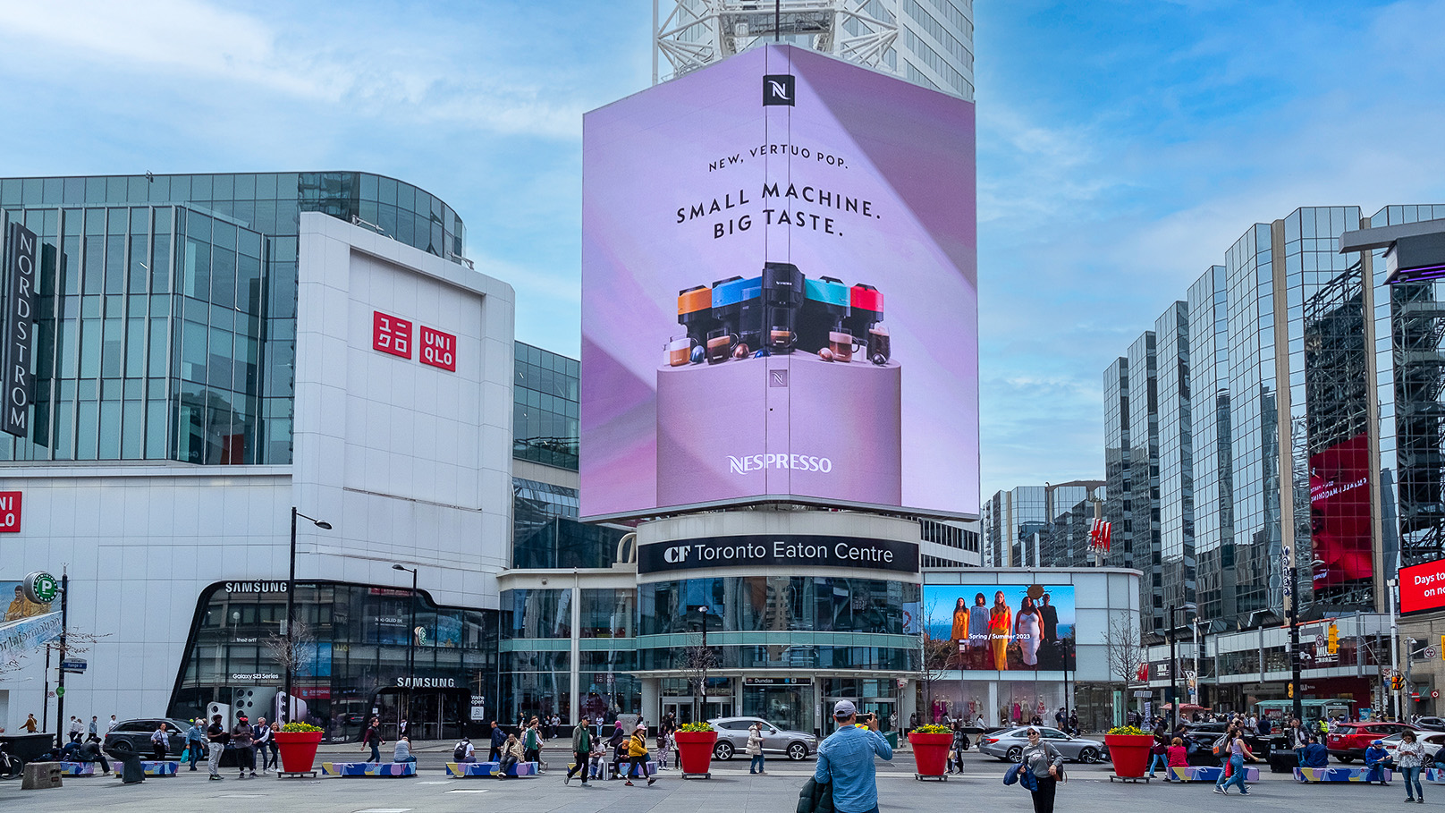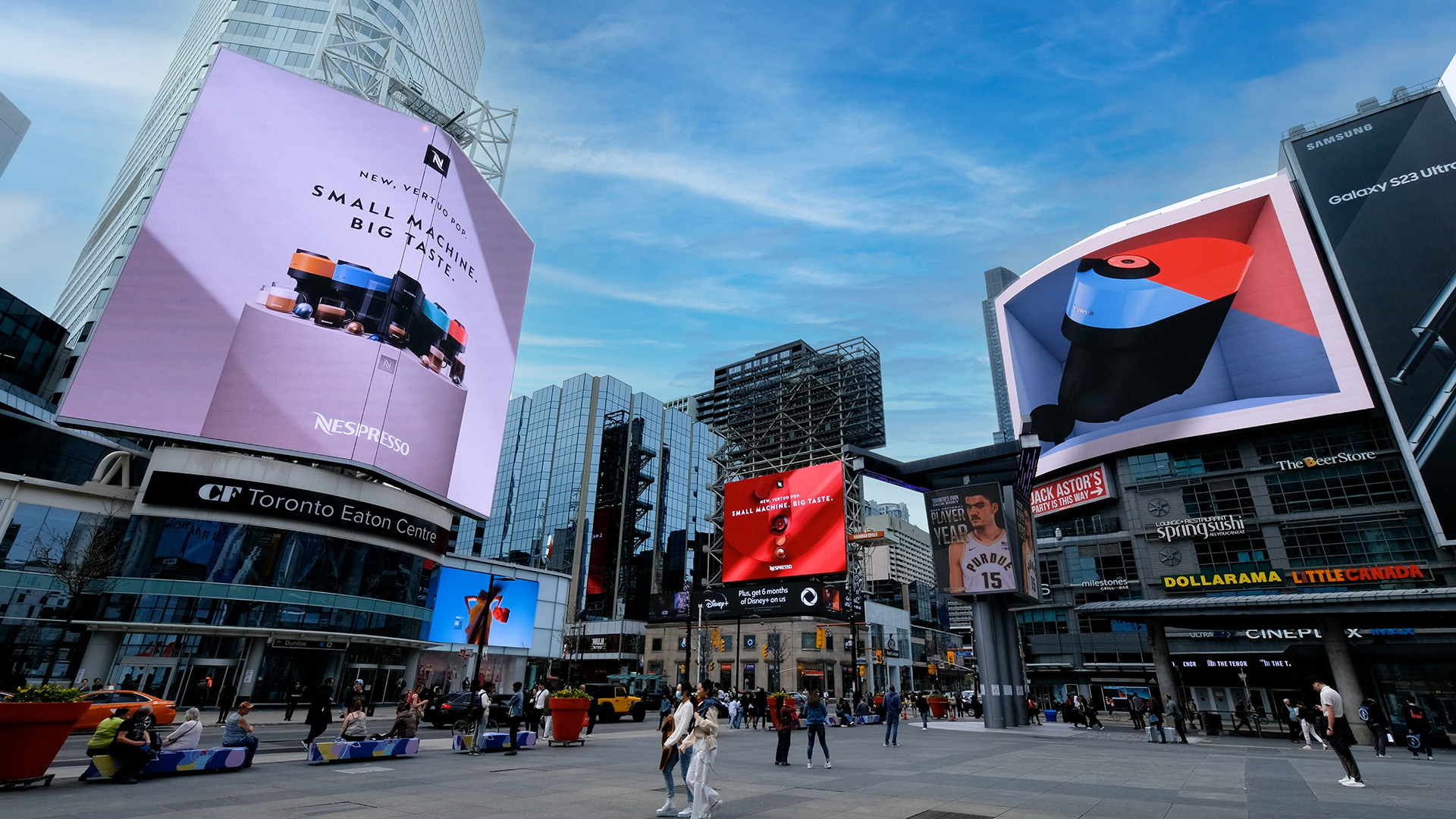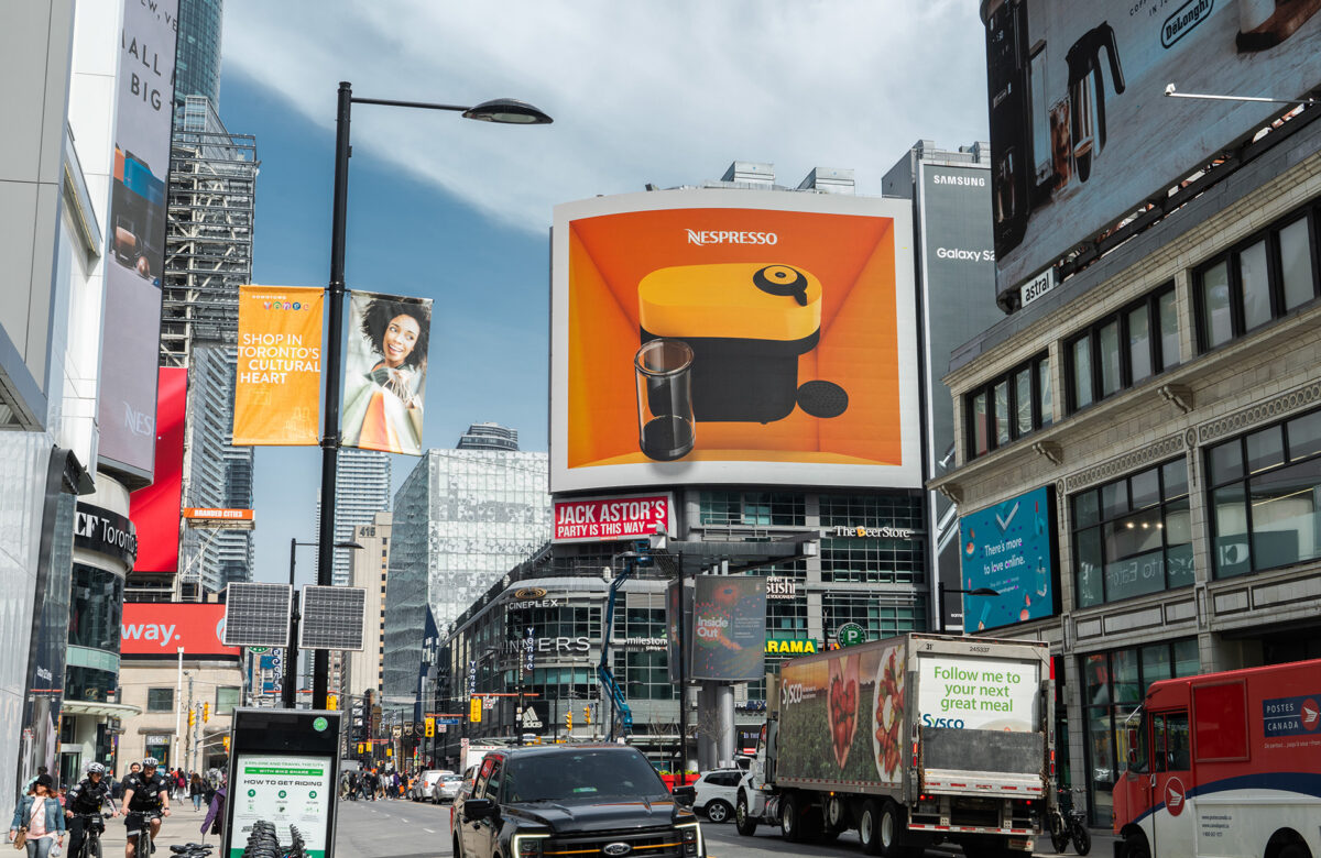 To launch the Vertuo Pop in Canada, Nespresso took over four billboards in Toronto’s Dundas Square — one of the busiest intersections in the country. The concept centered around a detailed 3D render of the machine, designed to show it off from every angle and let the product do the talking.