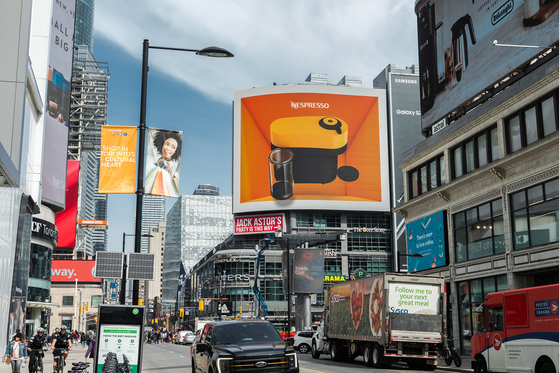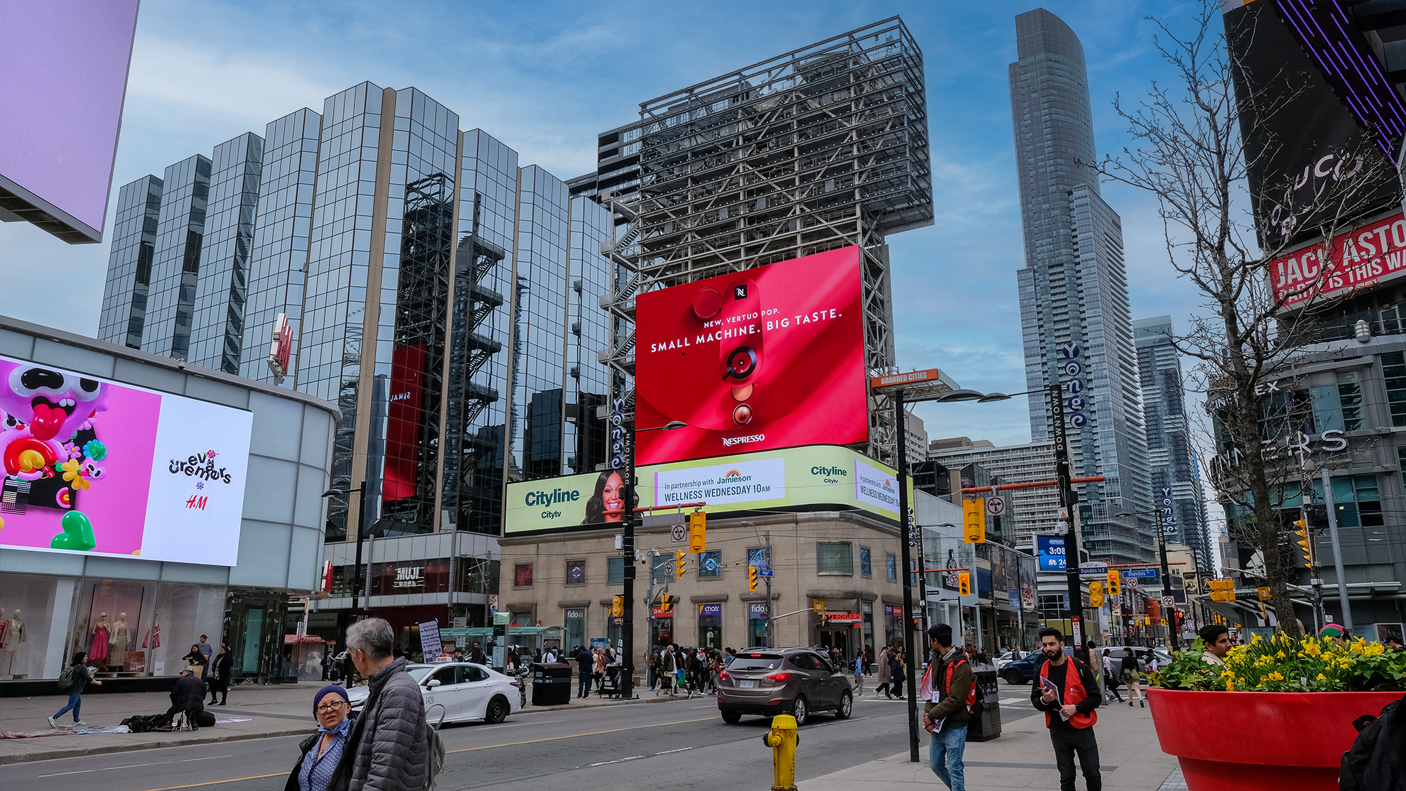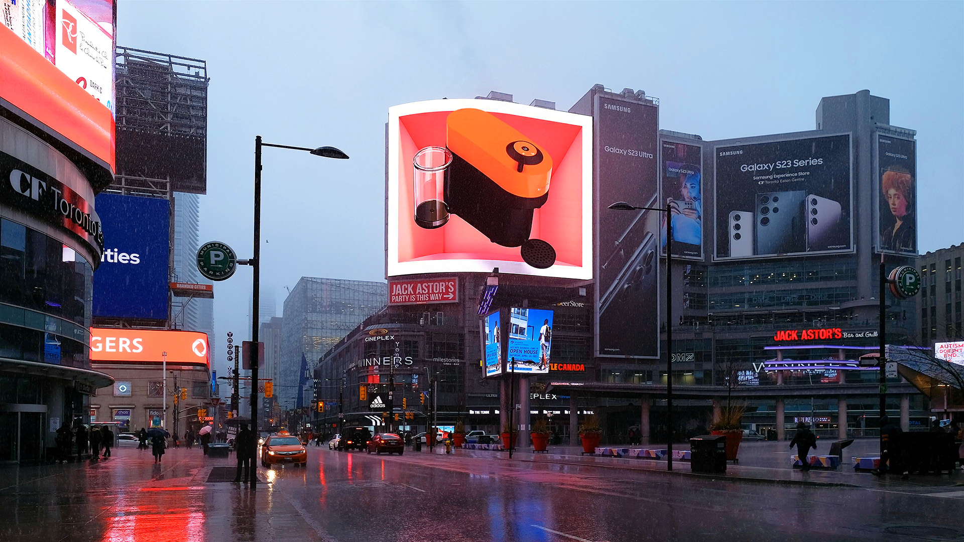 To launch the Vertuo Pop in Canada, Nespresso took over four billboards in Toronto’s Dundas Square — one of the busiest intersections in the country. The concept centered around a detailed 3D render of the machine, designed to show it off from every angle and let the product do the talking.