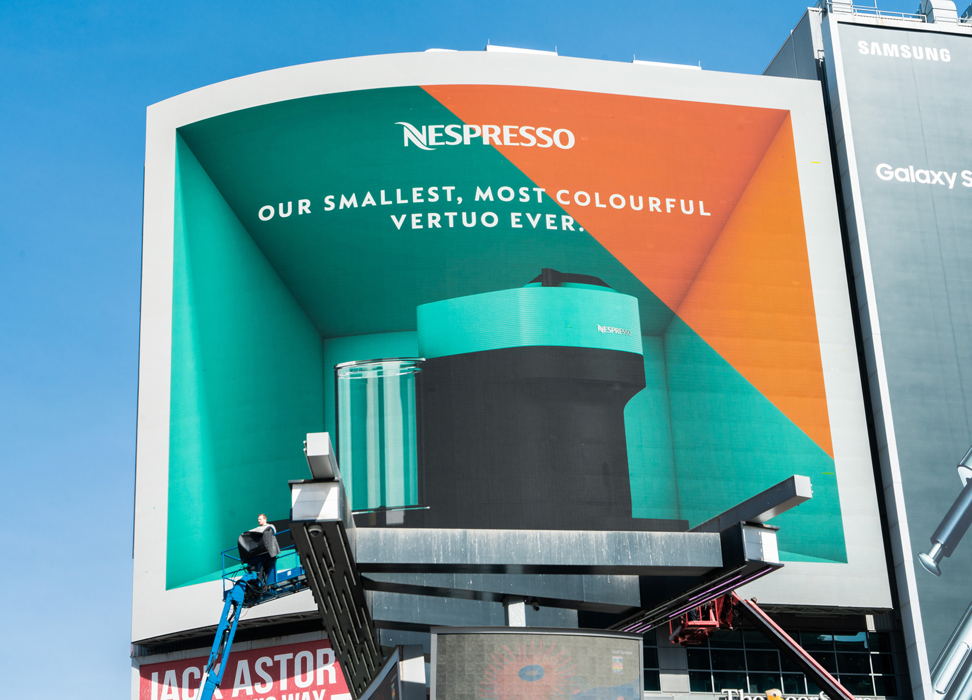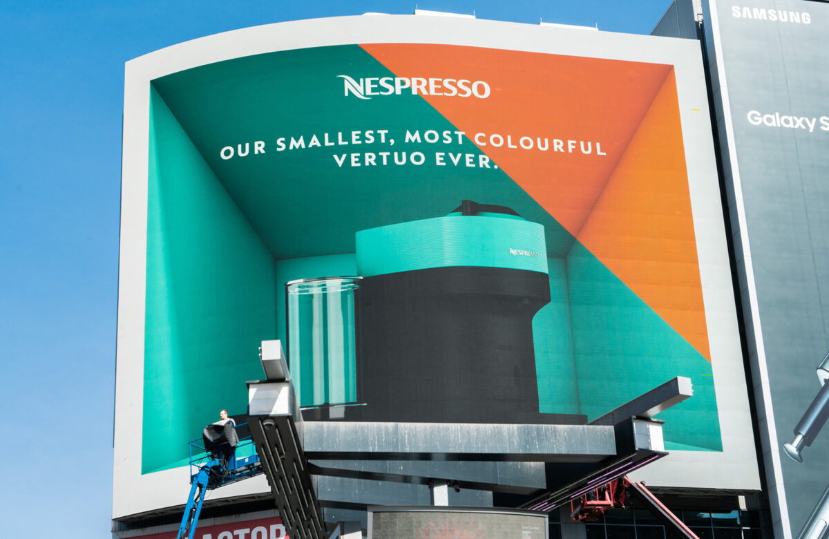 The real fun was in the execution. By framing the screen with a hollowed-out box effect, we created an optical illusion that gave the flat billboard a sense of real depth — as if the Vertuo Pop was actually sitting inside it. Viewed from street level, it felt almost physical. A simple idea, but one that stopped people in their tracks.
